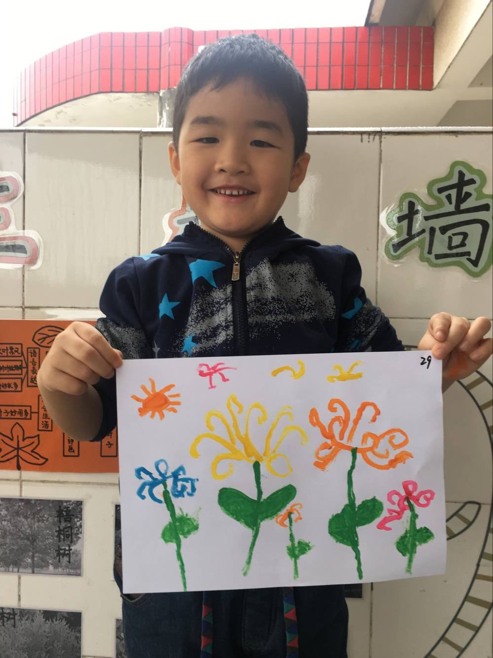 正值秋天,通过谈话孩子们知道了菊花是秋天特有的花卉,每到秋高气爽的时节,各式各样的菊花竞相开放。通过观看图片,孩子们发现并总结了菊花的特点:花瓣细细的、长长的、卷卷的。在熟悉了菊花的形态后,孩子们迫不及待地开始了今天的创作。