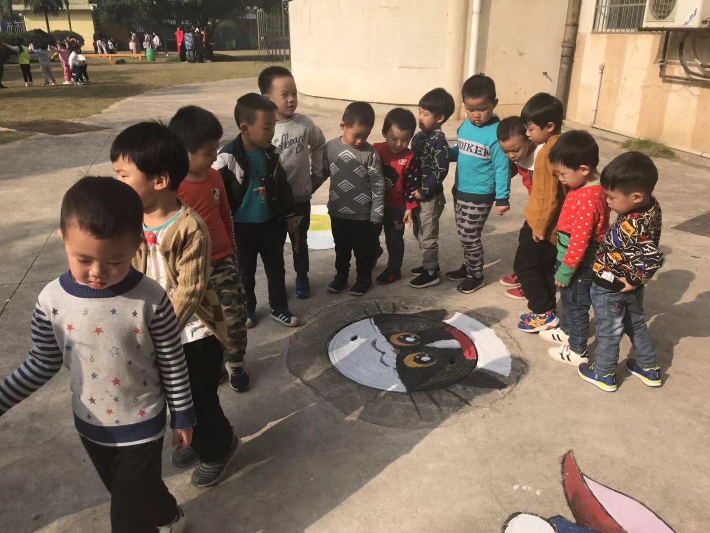 我们看到了大班哥哥姐姐们画的井盖艺术画,有我们最喜欢的黑猫警长!还有如假似真的煎蛋,看得我们口水都流出来了!哥哥姐姐们可真厉害,他们的作品如栩如生,真希望我们长大了也能像他们一样,画出这么美的图画!在阳光下,我们开心地游戏、舞蹈,整个幼儿园都是我们欢乐的笑声!