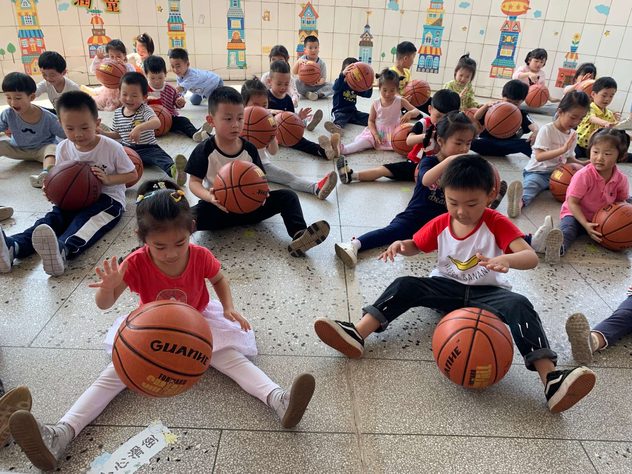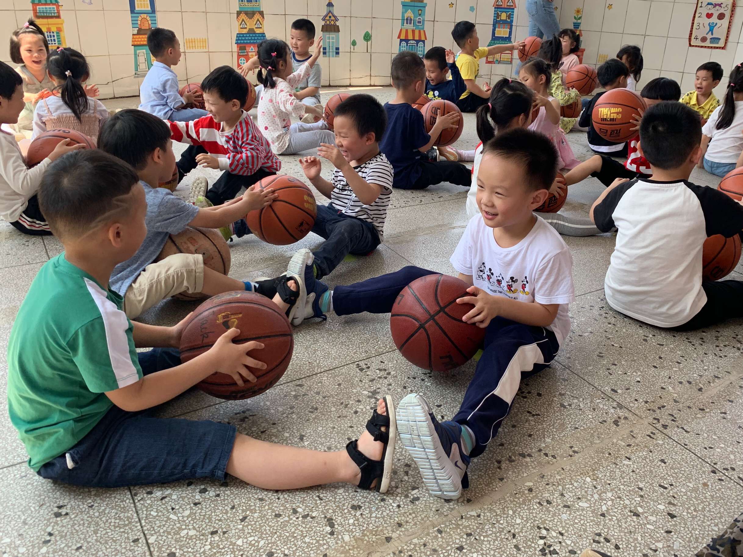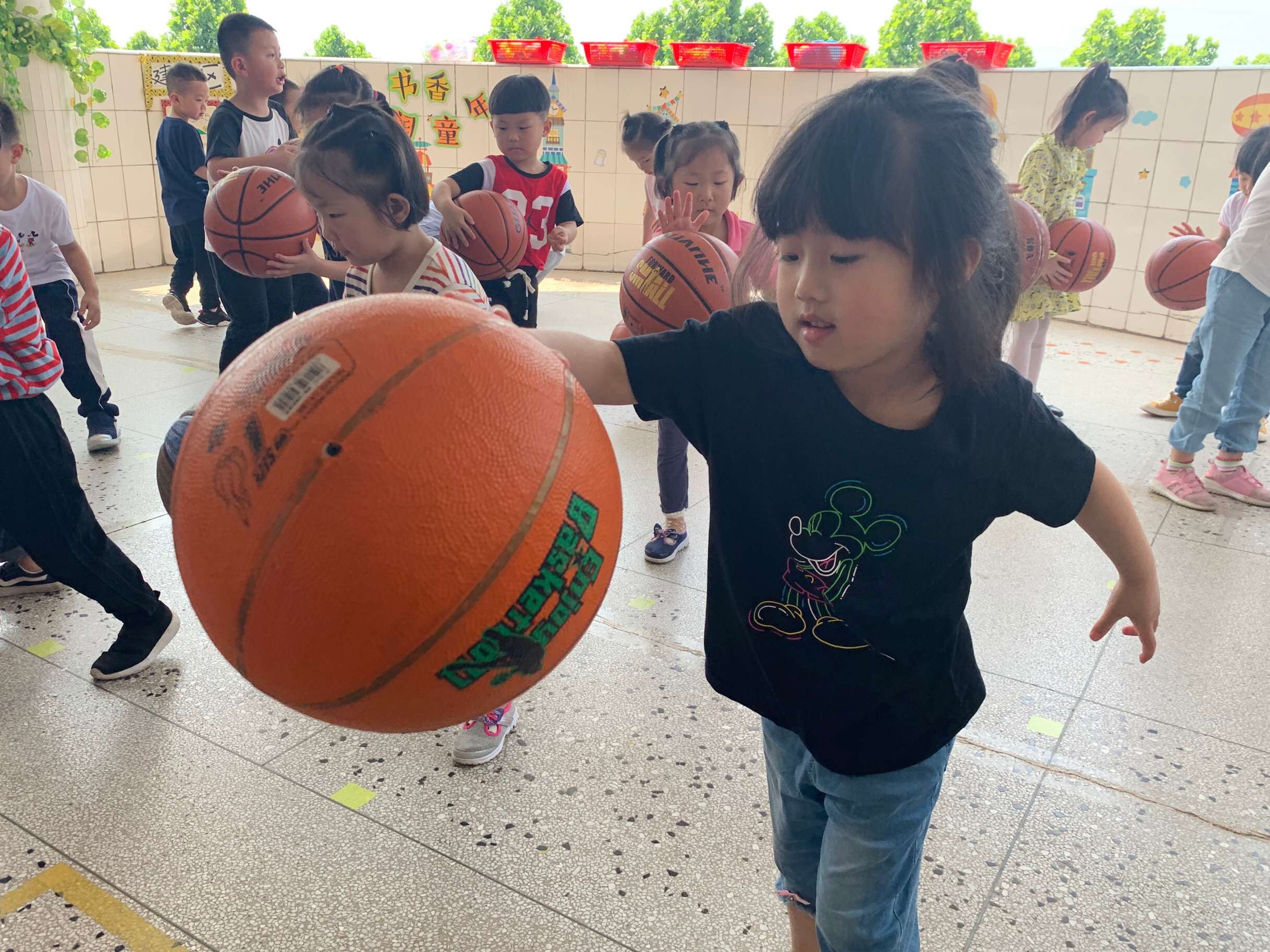 在中三班的弯弯墙里,每天都会传出一阵阵伴有节奏的拍球声,那是中三班可爱的篮球宝贝们,在老师的带领下练习。拍球、运球、投球……