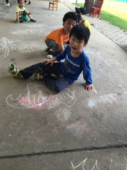 小朋友们拿着粉笔随意地在地上设计自己的小伞,