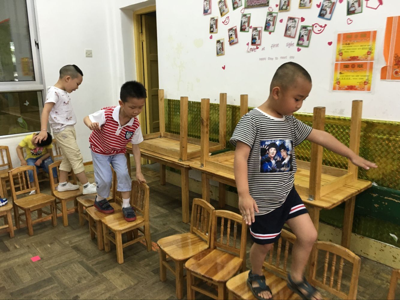 将所有小朋友的椅子摆成一条弯弯曲曲的“独木桥”