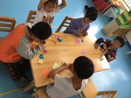 一共只有三步,漂亮的小花就做好啦。我们都拿出折纸跟着老师一起动手制作,原来真的不难呀!