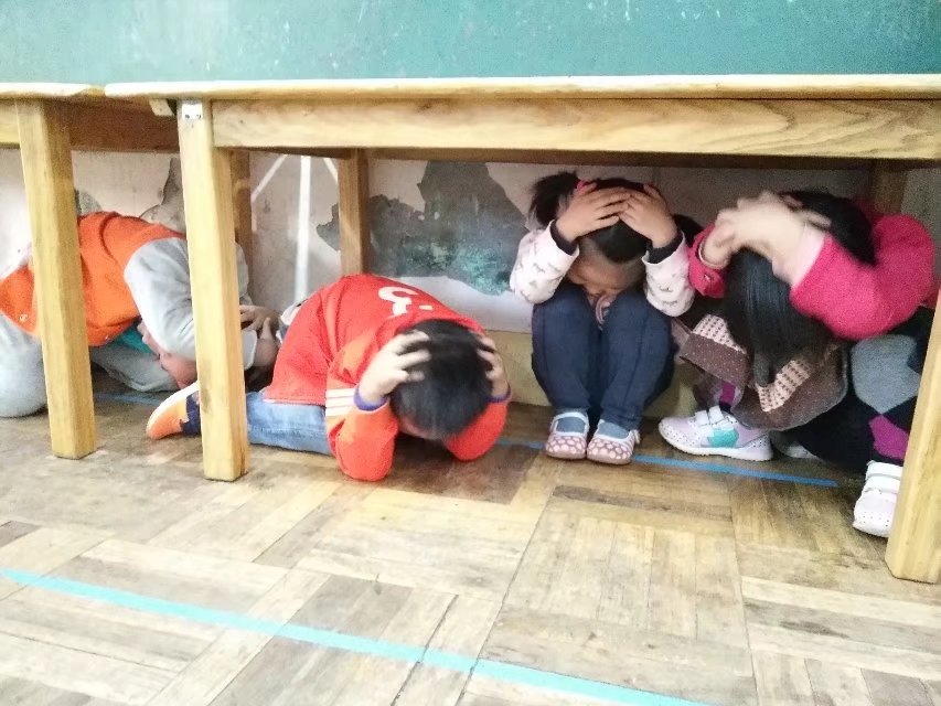 活动开始了,小朋友们听得可认真了,为了让小朋友们更深的理解,进行了安全演习,随着一阵急促的哨声,演习开始了。小朋友们在我们的引导下,纷纷寻找坚固的地方进行躲避,“抱头”、“闭眼”、“蹲下”,老师们不时地提醒着孩子。三分钟后,紧急哨声再次响起,小朋友们在老师的带领下,按疏散路线,转移到安全地域。到达集中地后,小朋友们都自觉地蹲下,双手抱头或用书包、枕头保护自己的头部、颈部······