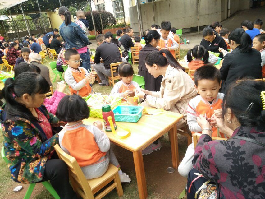 活动拉开了帷幕,首先家长、师生一起了解毽子是中国民间传统游戏,并观看花样踢毽子视频。然后下楼到操场集合,坐到班级指定位置。由主持人讲解制作毽子的步骤及制作的要求,亲子制作毽子,制作完的家长带幼儿在空地练习踢毽子,然后家长分组比赛“踢毽子”。活动如火如荼的进行中······
