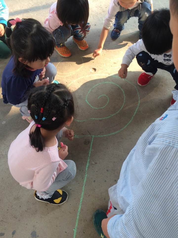 今天宝贝们认识了粉笔,第一次拿到粉笔小朋友们都非常兴奋,并在地上开始了自己的创作。