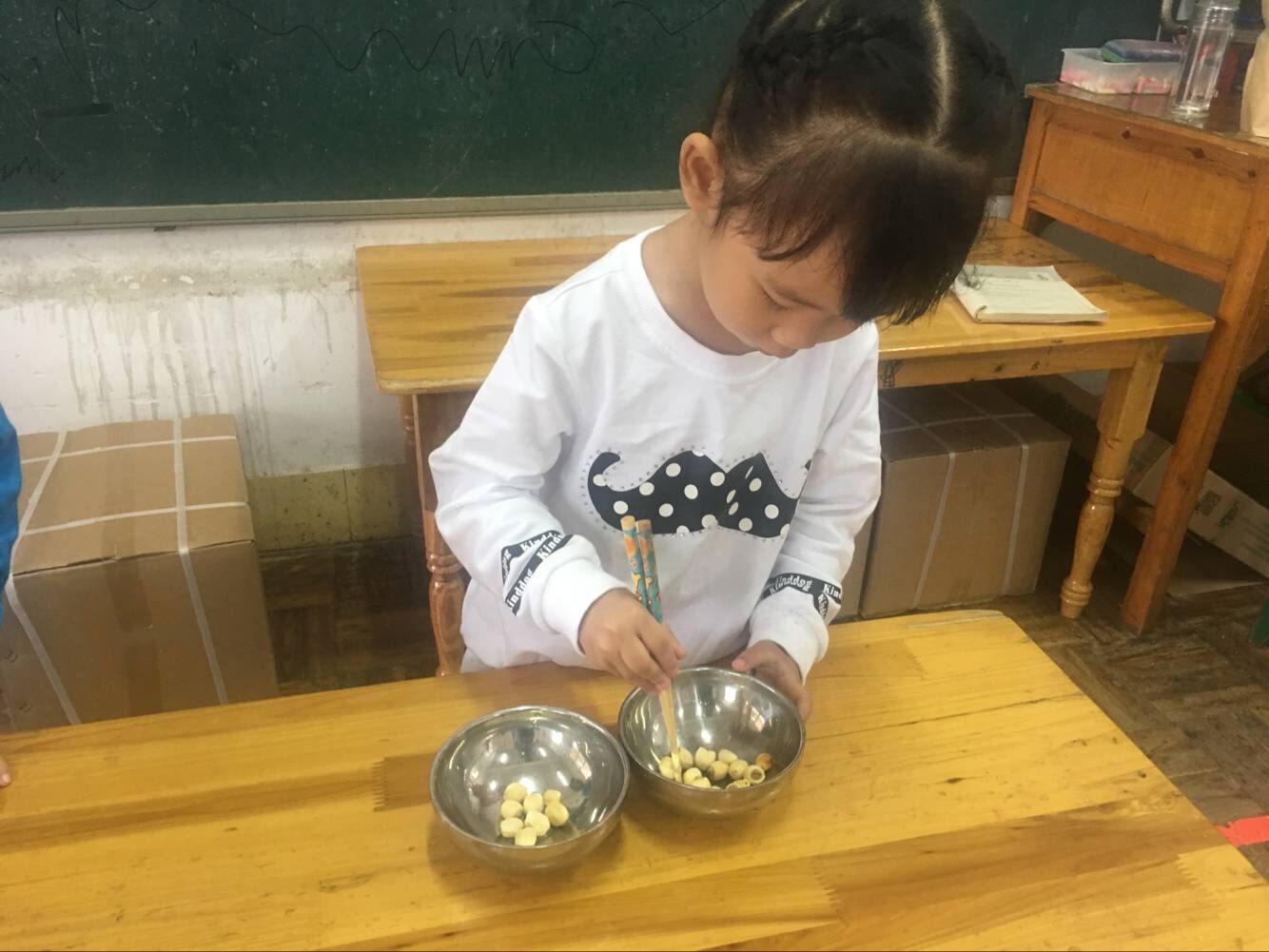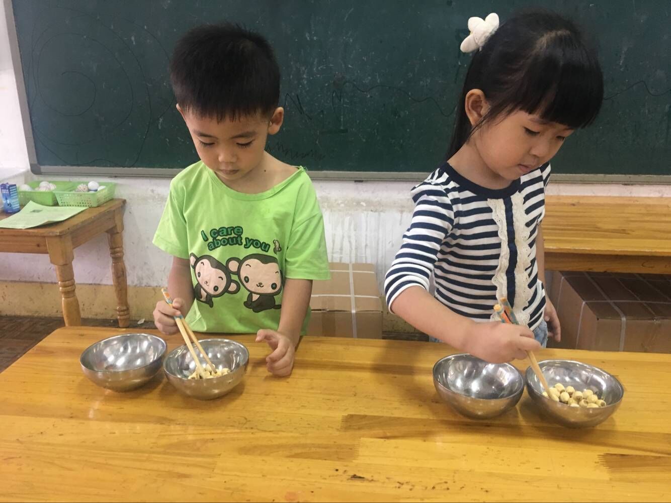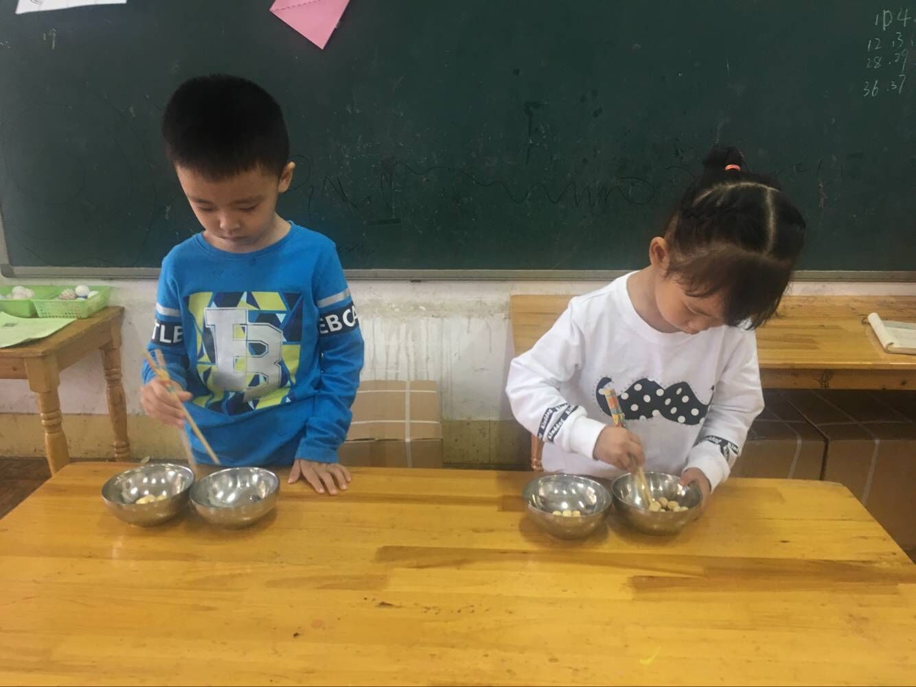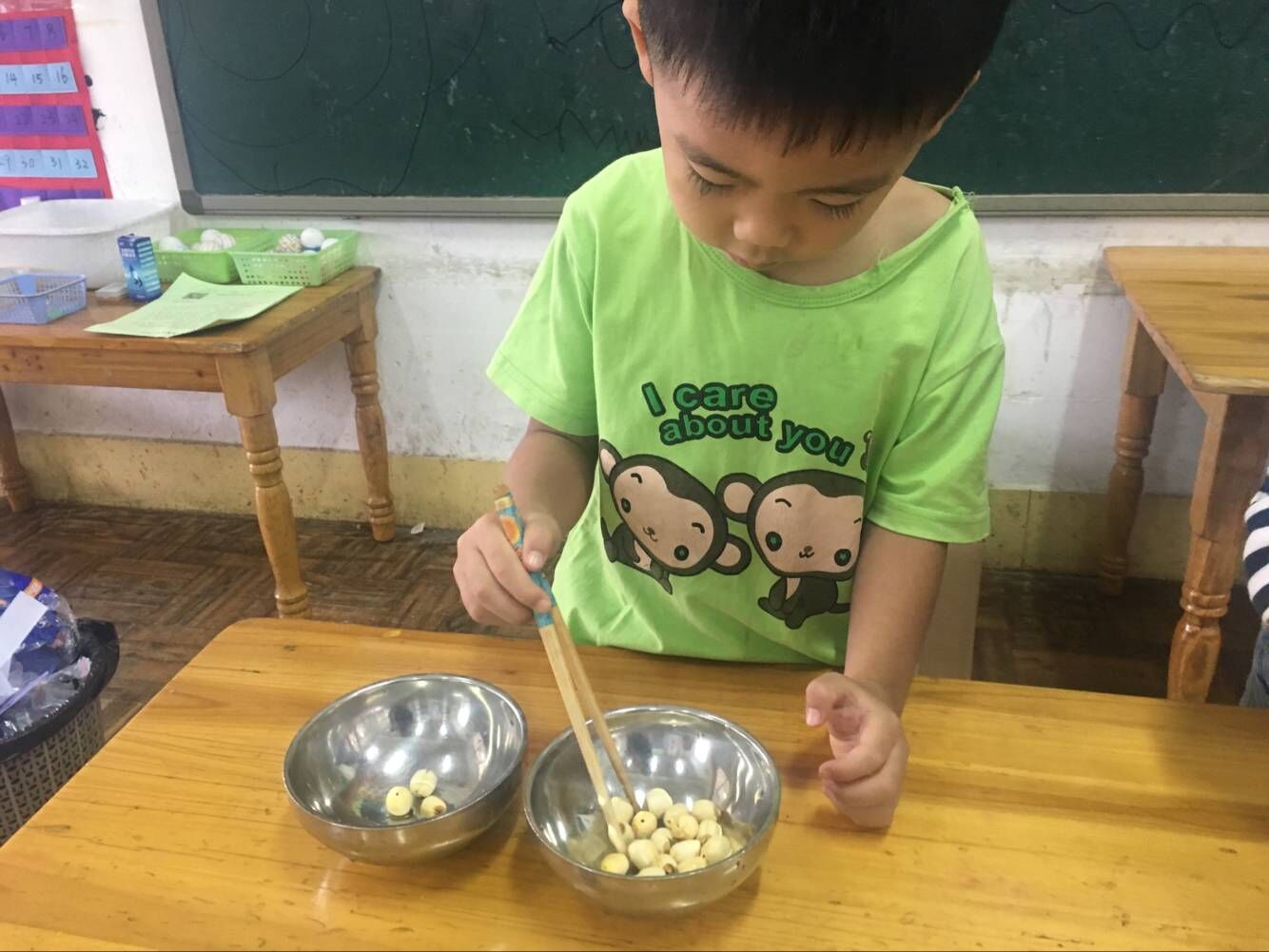 今天中一班举行了一次用筷子夹莲子的比赛。孩子们两人一组展开比赛,在一分钟的时间内,看谁夹的莲子个数最多。