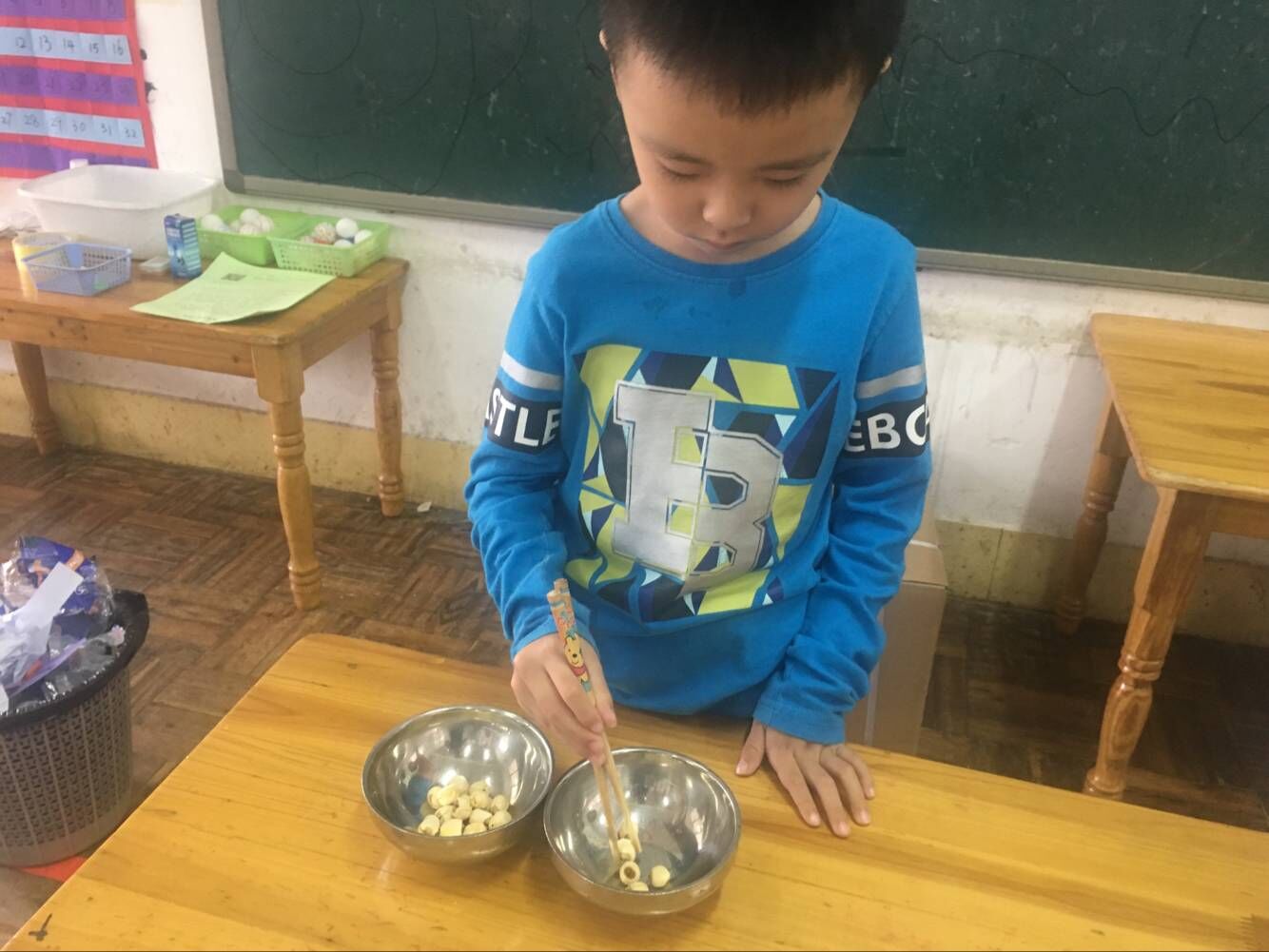 从使用筷子开始,不少小朋友就在家进行联系,有的从比较容易夹的串珠开始,逐渐过渡到花生,有的小朋友甚至开始练习夹黄豆了,一次又一次的挑战着自己的“极限”,也正是在这一次又一次的挑战中,孩子们对筷子的使用兴趣越来越高了。