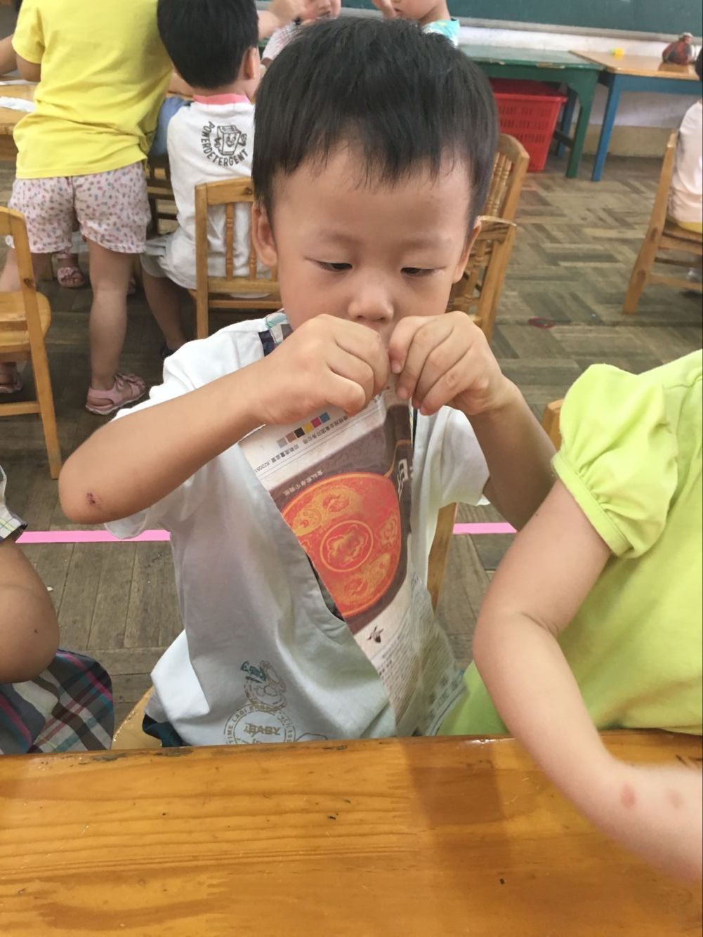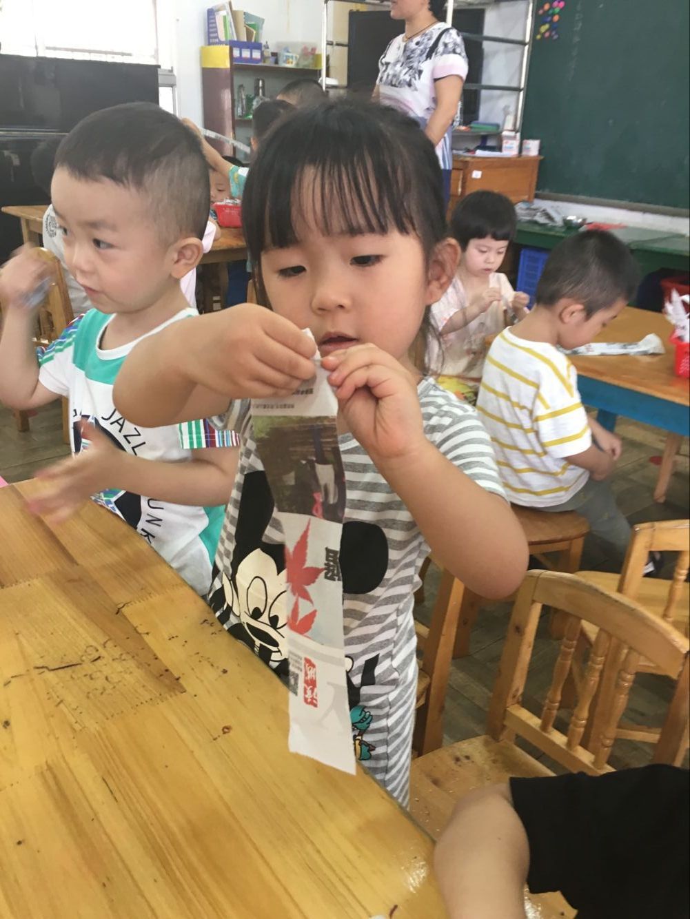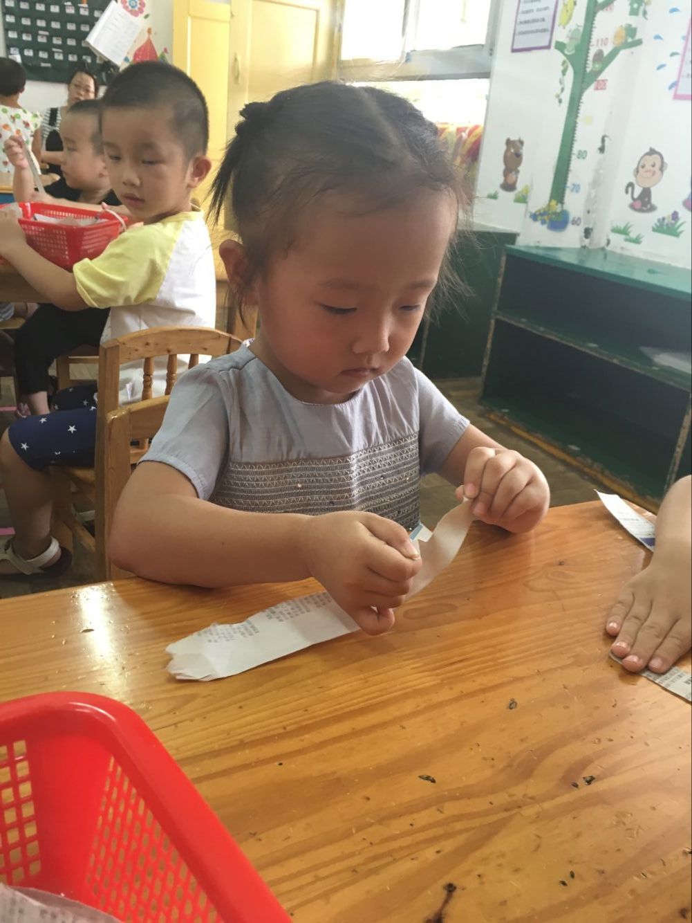 在自己动手“撕”面条的过程中,每一个小朋友都很专注