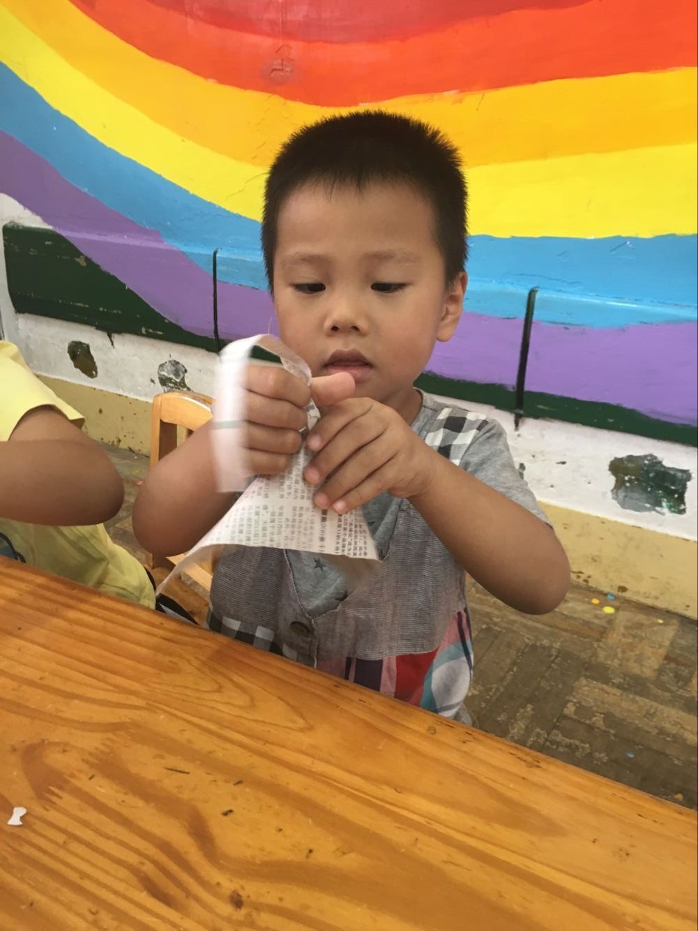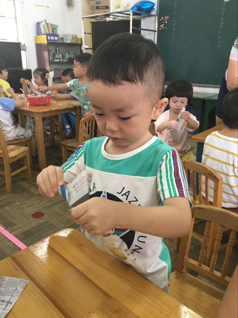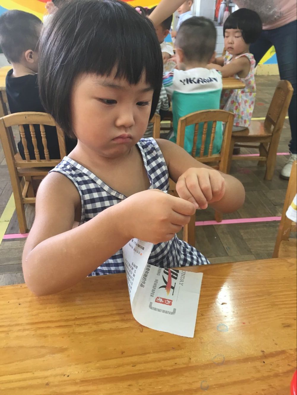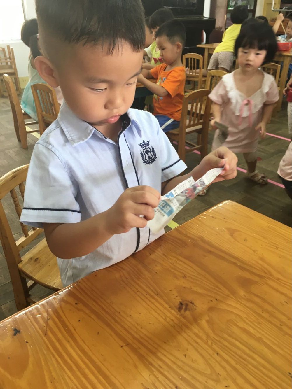 在自己动手“撕”面条的过程中,每一个小朋友都很专注