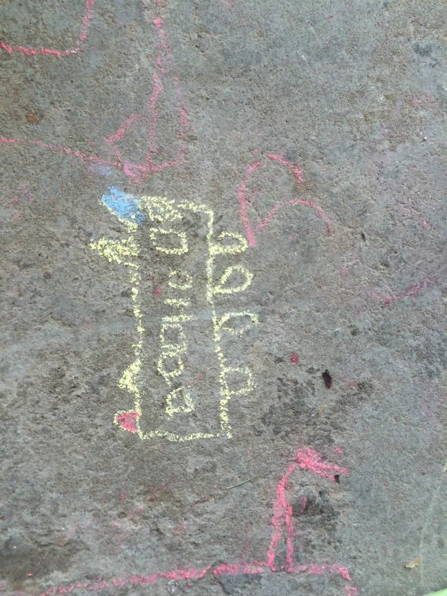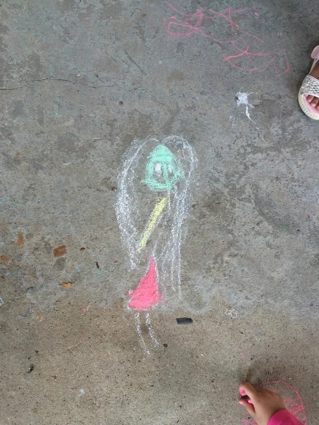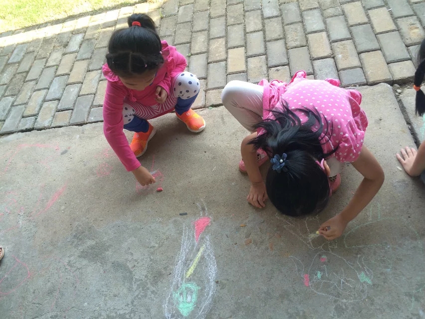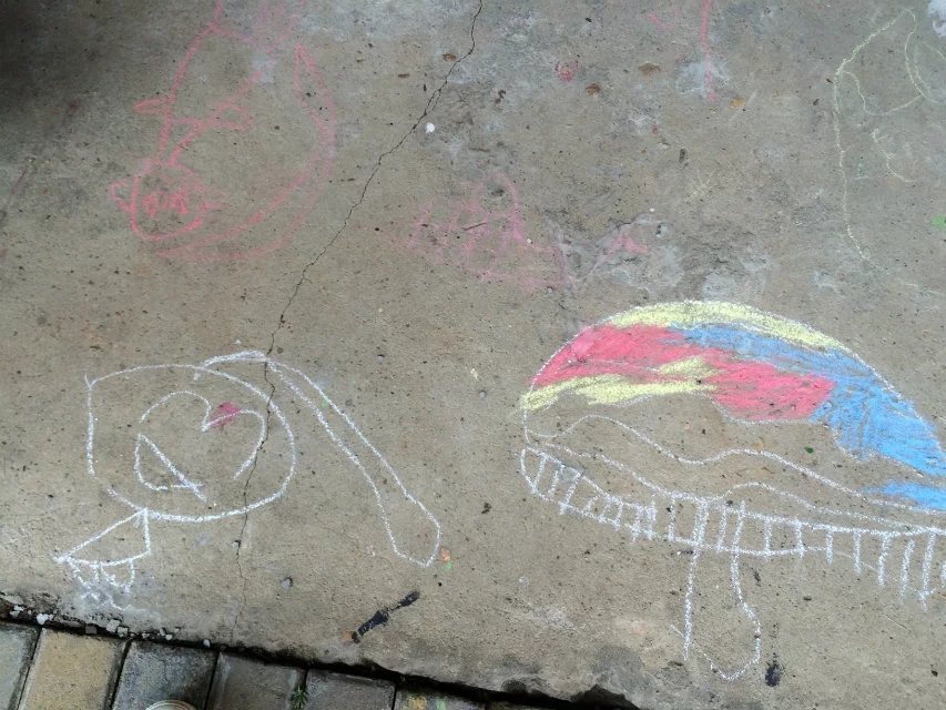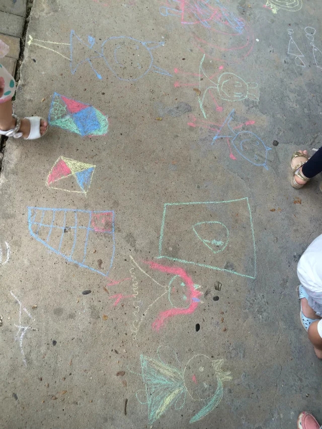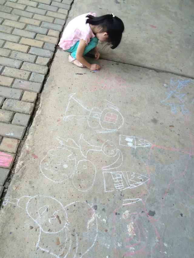 下午离园还差半小时时间,突然之间想到:怎么不带孩子们到走廊上去用粉笔来画画呢!孩子们看着我手里拿着很多的粉笔,都很诧异:老师,这么多粉笔用来干什么呀?我故弄玄虚:待会儿你们就知道了!