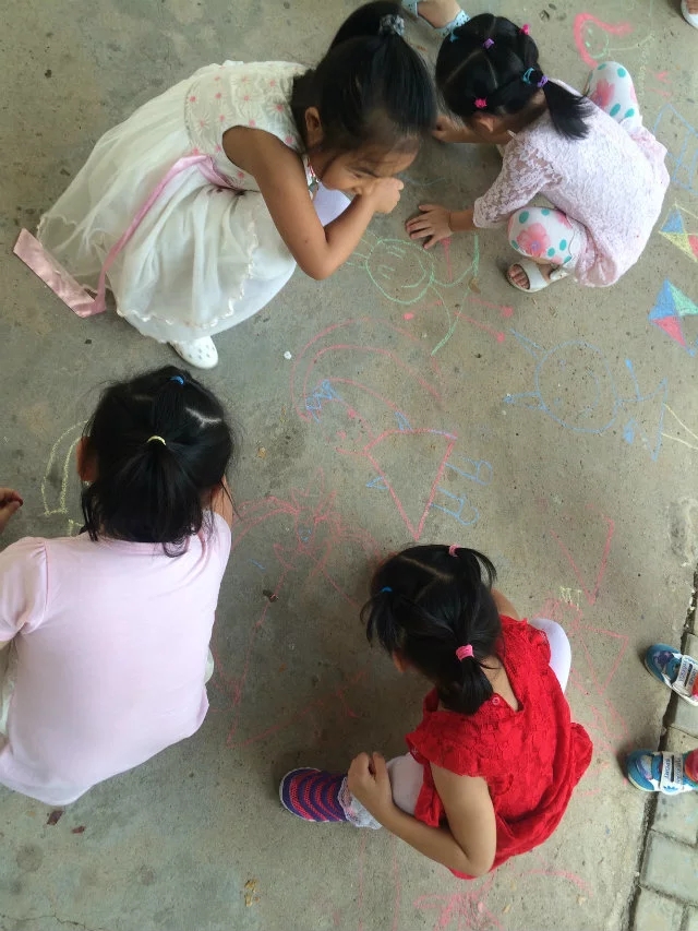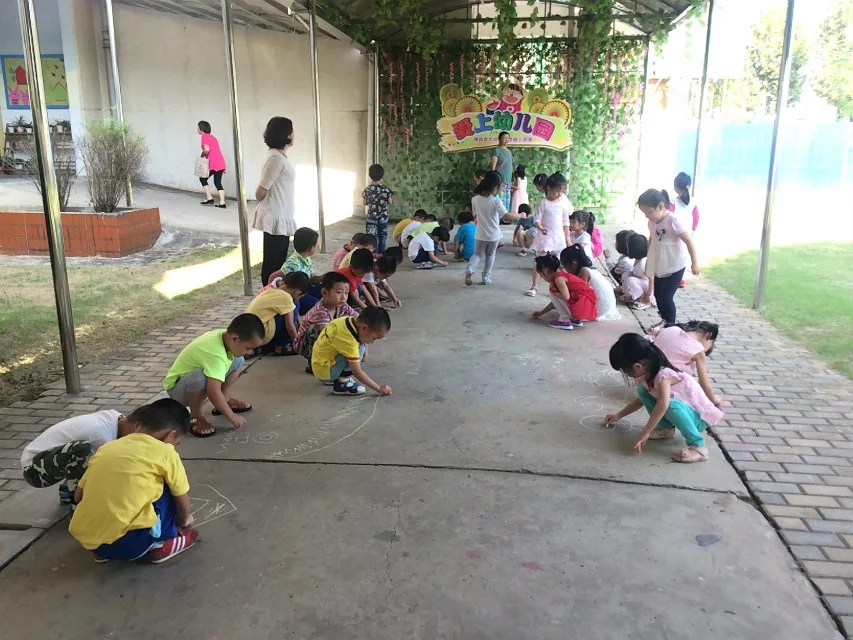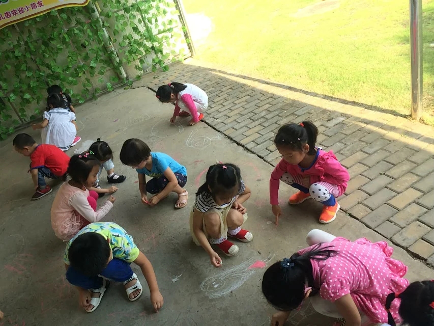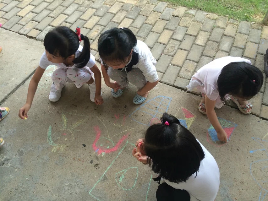 孩子们非常喜欢画粉笔画,瞧,他们开心地,自由自在地在地上画着自己想画的内容…有蘑菇房、美人鱼、公交车,小女孩……一边画一边欣赏同伴的画,孩子们开心到了极点,老师也被孩子们的兴奋劲感动着。心想着以后可以多安排这样的活动。因为孩子们平时作画都是在纸上进行的,且常常带着老师的要求去绘画,如"要画得干净,画在合适的位置"等等,有部分孩子由于握笔姿势不正确或技能较差,往往是纸上"脏乎乎的",老师对于这样的作品关注的并不是太多,时间一长,孩子就会有心理压力,害怕画,对绘画没有兴趣。而画得好的,干净的孩子要受到老师的表扬,这样一来,幼儿绘画基础上的差异就会出现"画得好的爱画--多画--画得更好--兴趣更高;画得不好的怕画--不画--更不会画--没有兴趣"两个极端,没有兴趣的孩子每次绘画活动只是被动地接受老师的教育。而用粉笔画画就避免了这种现象,让每个孩子有了作画的兴趣。有了绘画的兴趣孩子们在绘画过程中思路更开阔,更能发挥创造性。