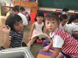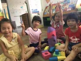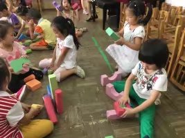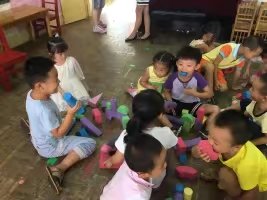 今天玩了我们最喜欢的建构区,虽然我们每个人只有五个积木,但是我们和好伙伴们一起堆积木就有许多块积木了,我们一起合作,搭了一个我们都很喜欢的城堡。我们都喜欢用三角形和半圆形来做屋顶,这样会让我们的城堡更漂亮。我们这些小小建筑师还不赖吧!