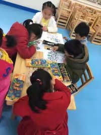 我们的美术区,有好多油画棒,今天我们还用超轻粘土做了盘子画,看起来可真不错呢!