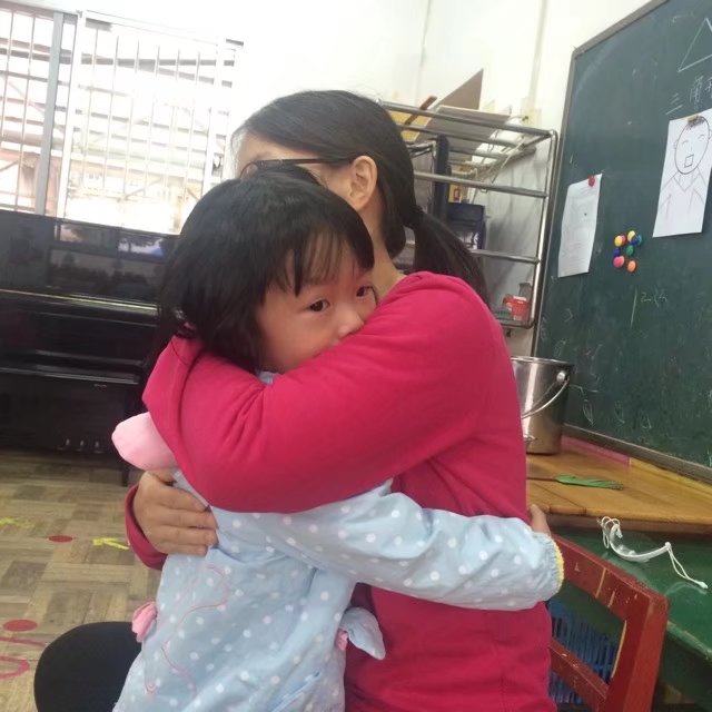 早晨进了教室的妍妍,依依不舍的和外婆说了再见后就投进了苹果老师温暖的怀抱!