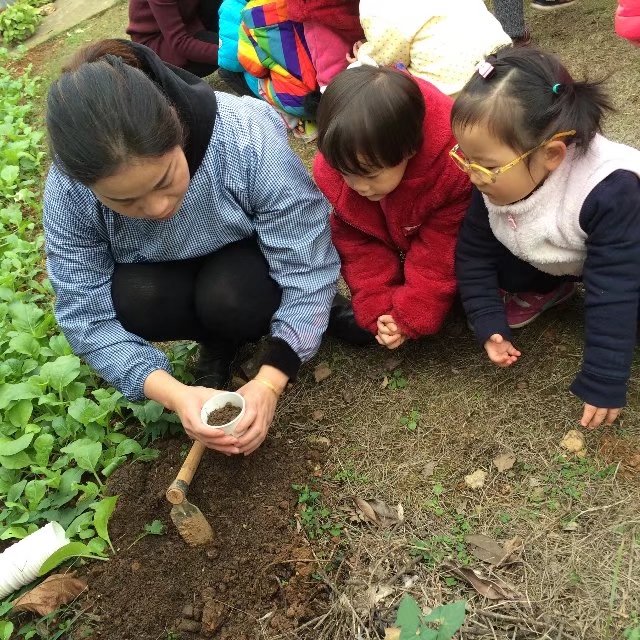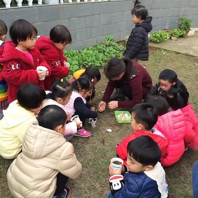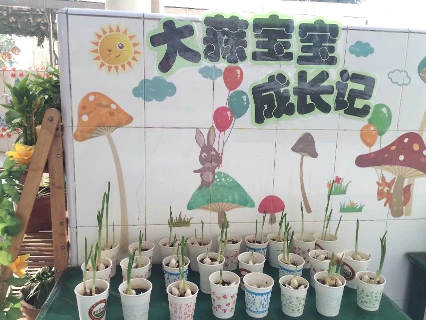 2017年11月24日 星期五,苹果老师带领咋们小二班的宝贝们开展了种大蒜的活动。幼儿的思维是具体形象的,在学习过程中乐意接触有一定生活经验的事物。因此开展了本次活动,选取生活中常见的大蒜作为活动的载体,贴近幼儿生活。激发孩子们对科学种植活动的兴趣,提高孩子们的感知能力和观察能力,培养幼儿参与生活实践的兴趣和热爱生活的情感。在活动过程中,从认识大蒜头、认识蒜瓣到用幼儿能力范围内的“按”的方法种大蒜,始终让幼儿以高涨的热情参与活动,进行探究与操作,并且能用简单但清晰的语言描述自己的看法。小班幼儿喜欢模仿、喜欢和老师互动,因此,引导幼儿模仿老师用“按”的方法种植自己的大蒜,进一步提升了幼儿的认知经验,同时也增长了幼儿的种植能力,提高了手指的灵活性。给幼儿提供实践操作的机会,让幼儿调动多感官参与活动,在自己种大蒜的真实体验中,提高了幼儿的观察能力、动手能力,也真正地做到了让幼儿在做中学、在玩中学。活动过后,老师们把种好的大蒜整齐有序的摆放在自然区角旁边,幼儿通过实际的观察,发现大蒜宝宝每天的变化,了解大蒜宝宝的成长过程,激发幼儿探索科学兴趣的同时,起到了很好的延伸效果。