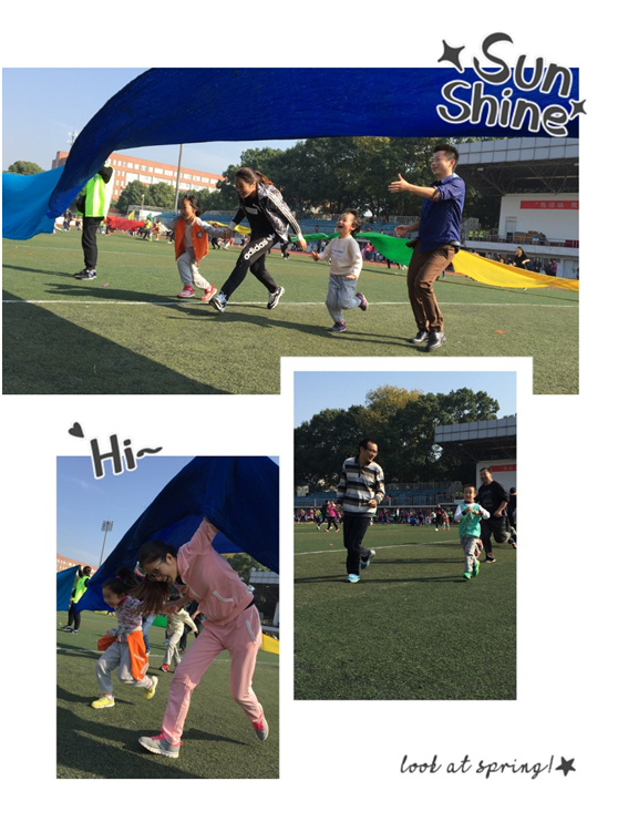接下来一段亲子舞后是亲子游戏环节,每一环节都巧妙的融入了跑、跳、钻、爬、平衡等幼儿们应该掌握的基本动作,看着家长们和孩子们张张满意的笑脸就是对我们最好的肯定。