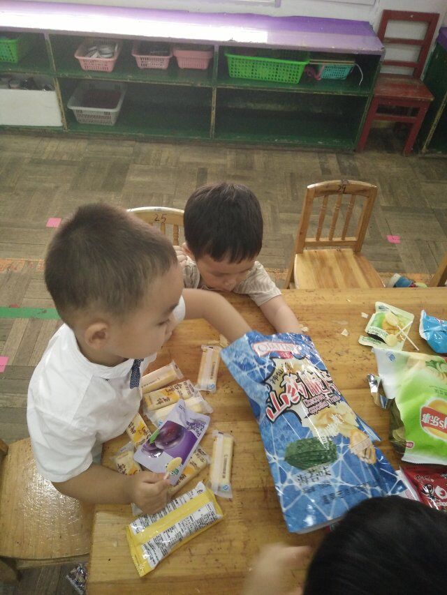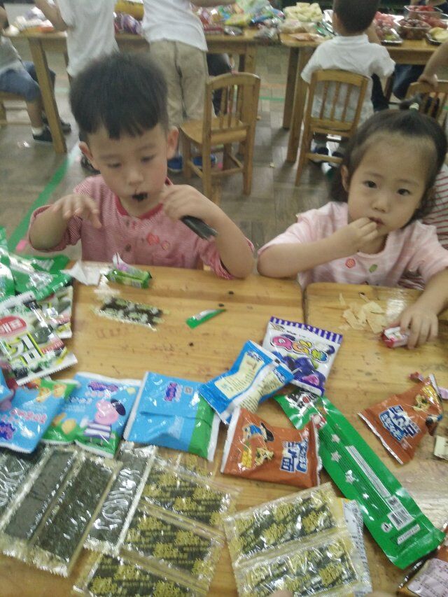 起床咯,小朋友们都非常高兴,因为啊下午有小小美食分享会。小朋友们陆续洗手,上厕所,喝水后,看见教室摆满了好多好吃的。有的小朋友有点迫不及待了,问“老师,我们什么时候可以吃这些好吃的,老师这些好吃的我们都可以吃么”洗完手后的小朋友自己搬椅子坐在两旁,桌子上摆满了好多零食,有海苔,有饼干,有水果,还有好多好多都是我们爱吃的。。