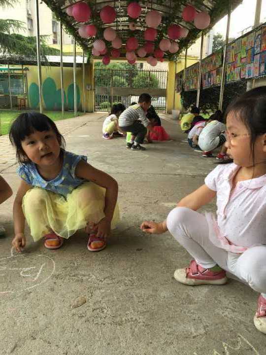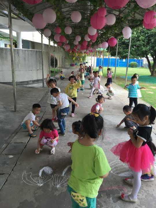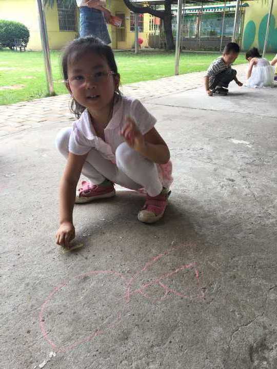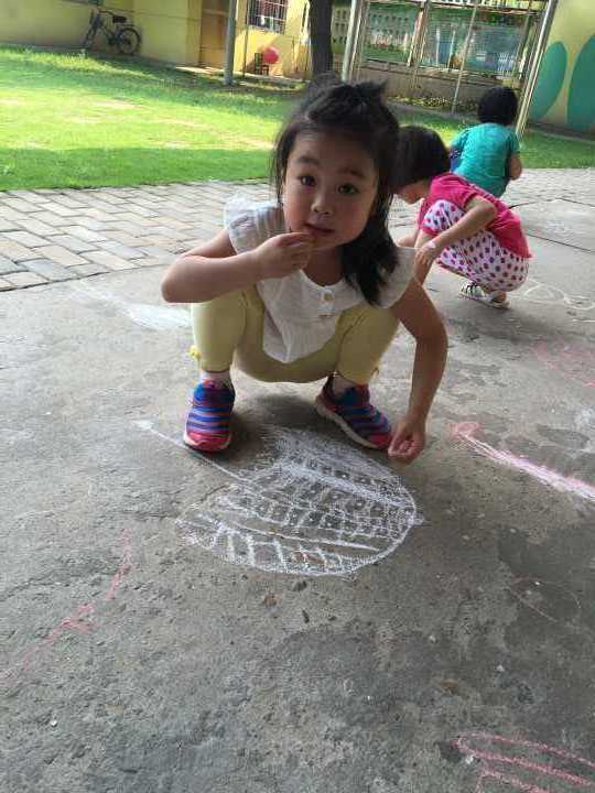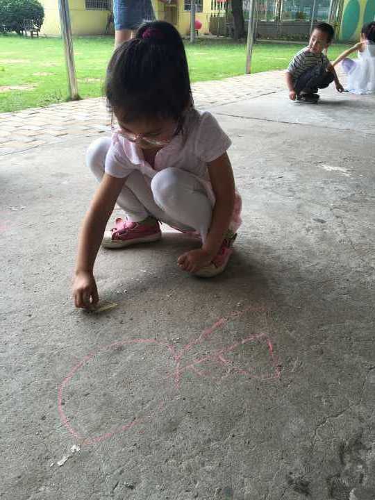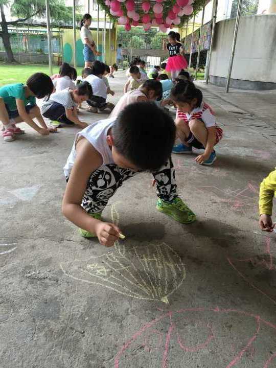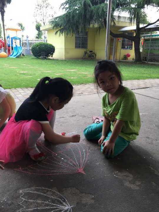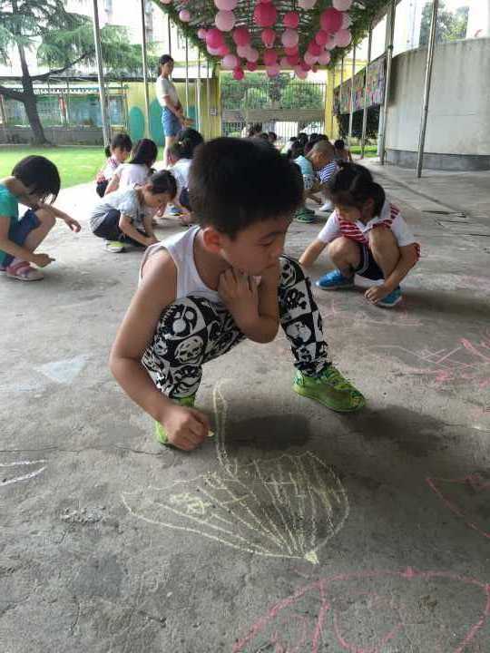 小朋友们拿着粉笔随意地在地上设计自己的小伞,