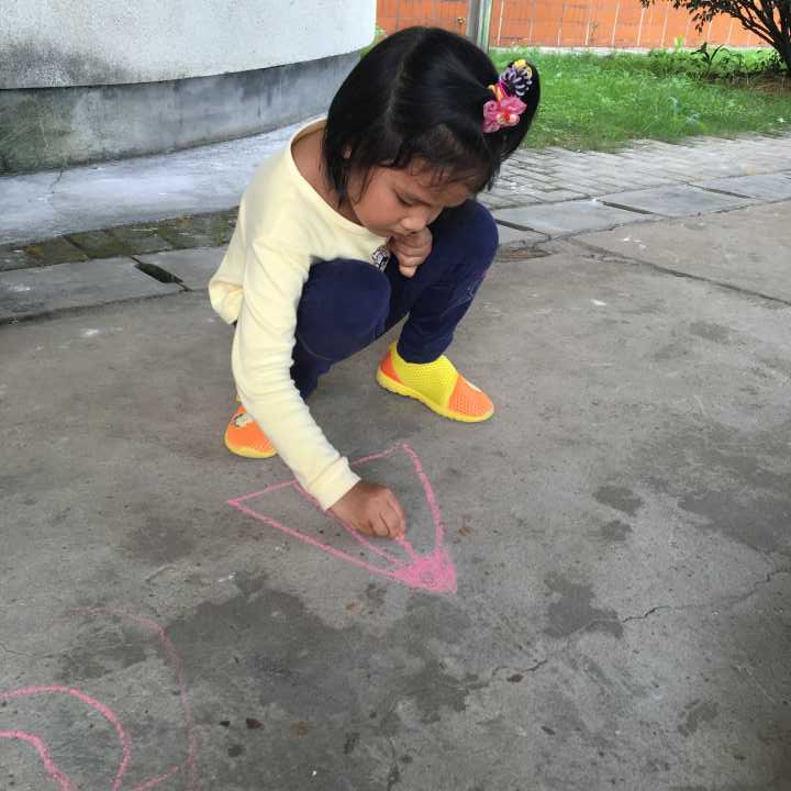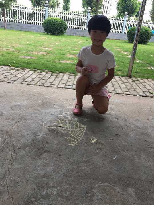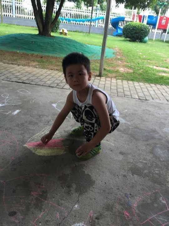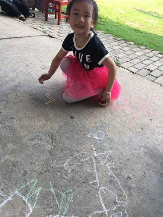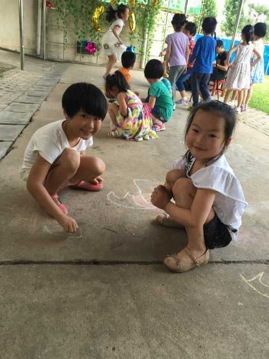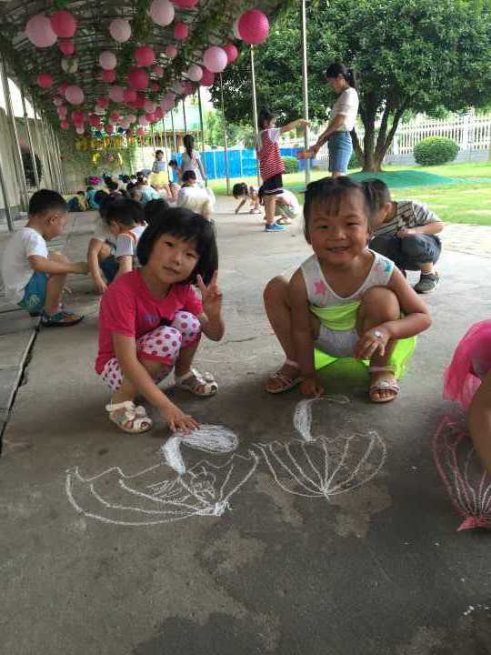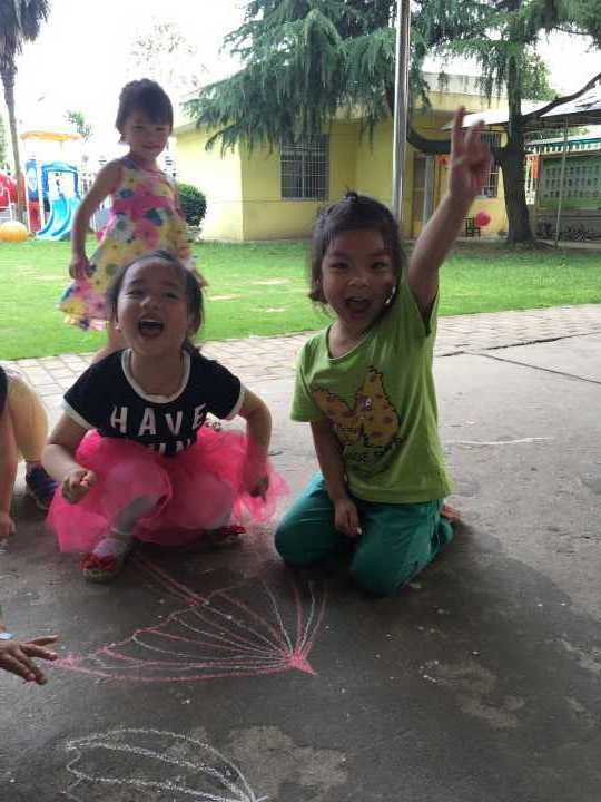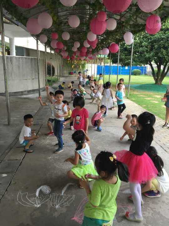 小朋友们拿着粉笔随意地在地上设计自己的小伞,