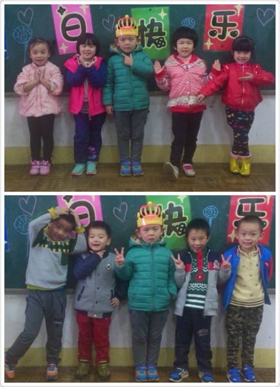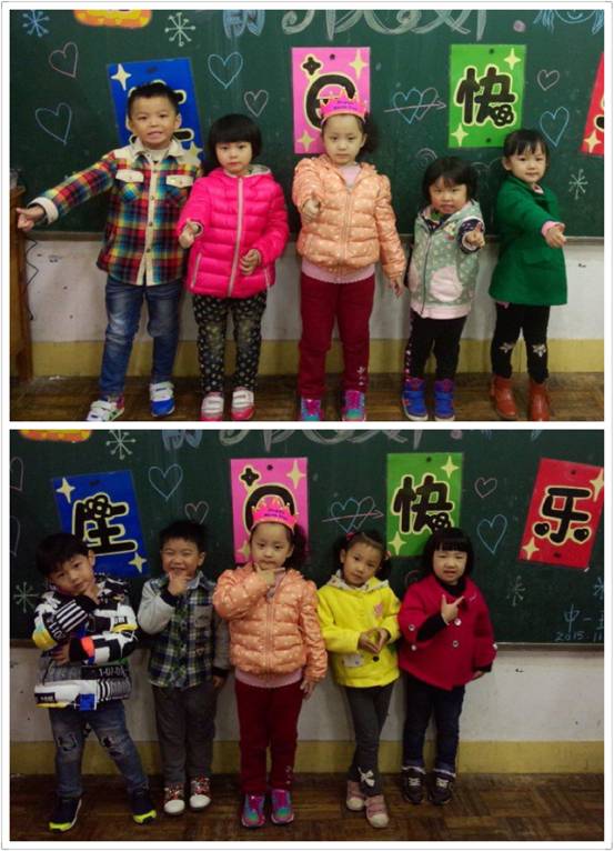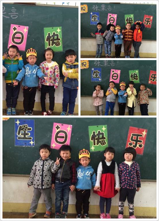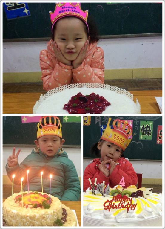 蛋糕摆上桌,班里就炸开了锅,孩子们又是蹦又是跳,我们老师赶快组织孩子们安静下来,先把过生日的“小寿星”请到台上,并亲手为他/她带上生日帽,接着,全班小朋友与老师一齐为他/她唱生日歌“祝你生日快乐,祝你生日快乐……”只见“小寿星”激动的满脸通红,就像个熟透的大苹果。在大家的歌声中,他/她脸上洋溢着幸福的笑容。