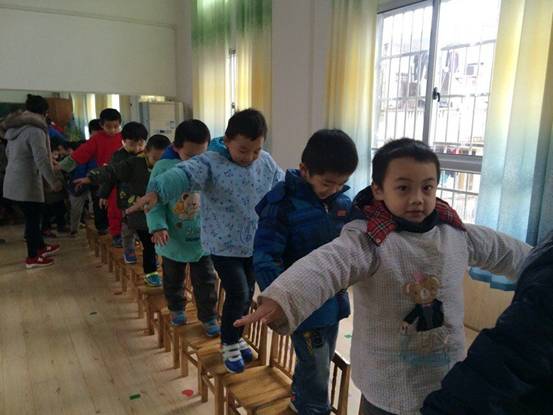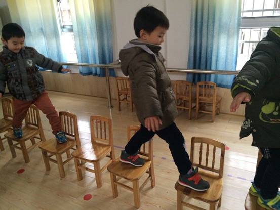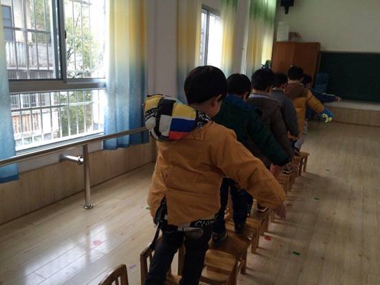 拆掉了其中的部分,在最后一张凳子上以高台跳水的动作下地。让幼儿发展幼儿身体的平衡