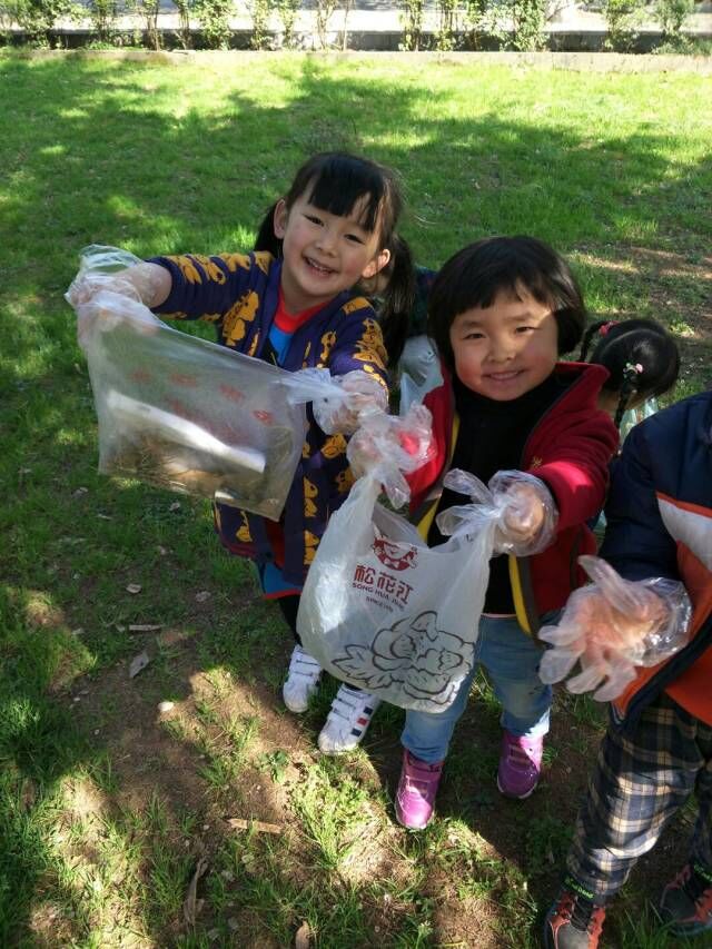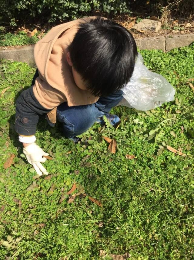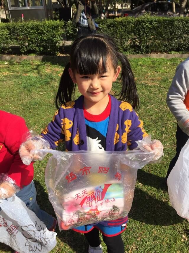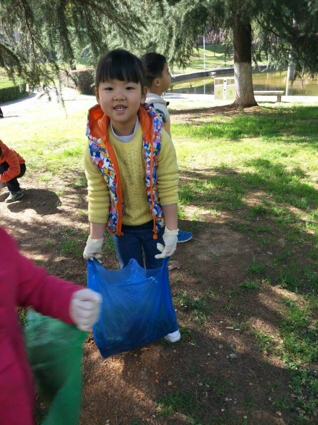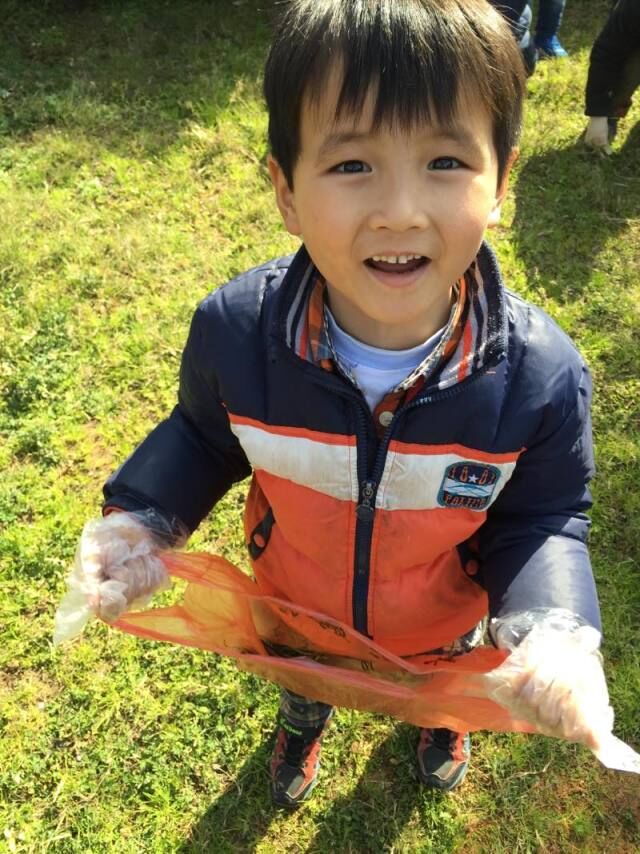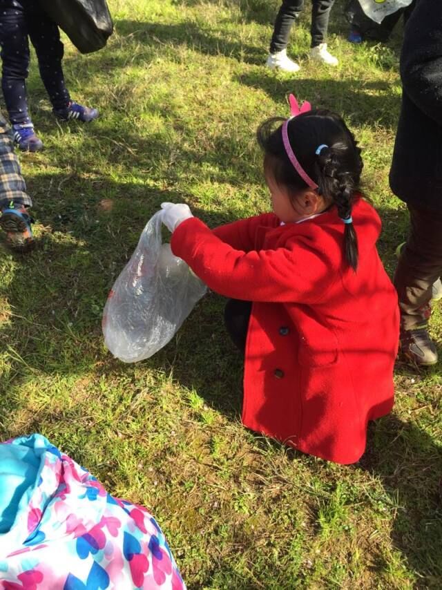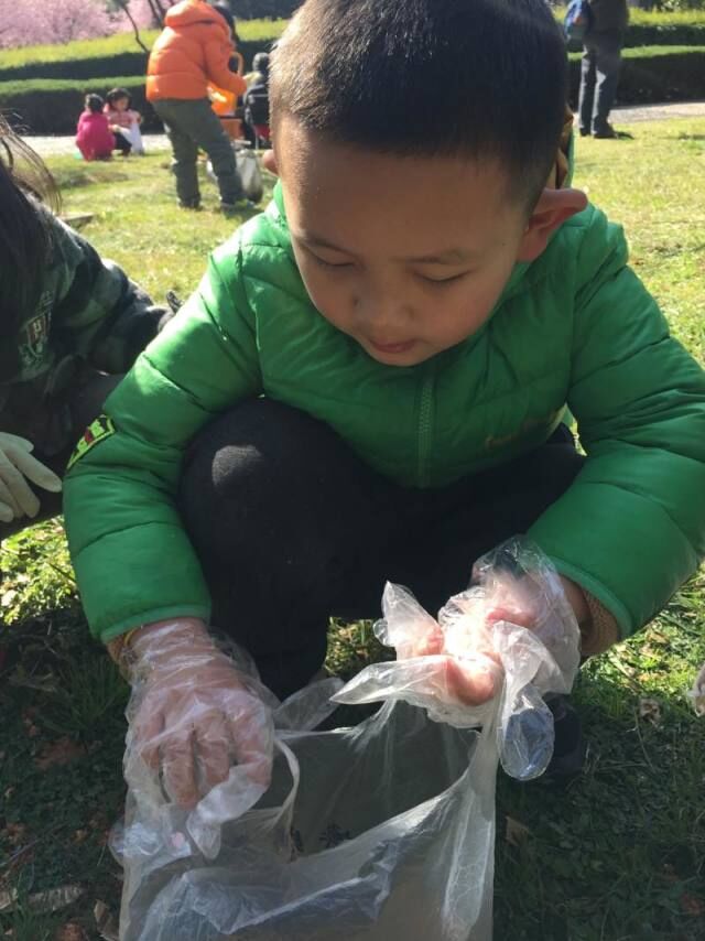 大一班的老师将爸爸妈妈们事先准备好的手套、垃圾袋等物品分发给每个孩子并讲解了各种规则。瞧!这群孩子,别提多兴奋、多积极了,一个个低头细细搜罗着草地上、小路边的垃圾。