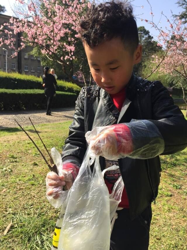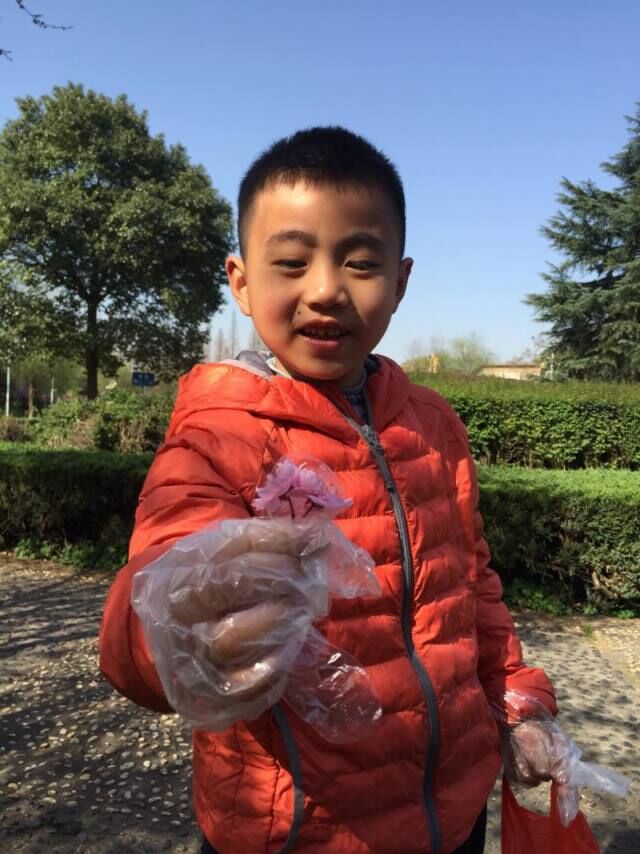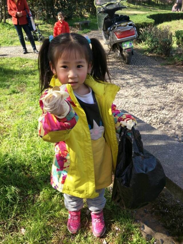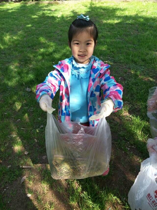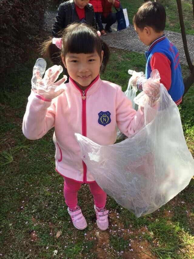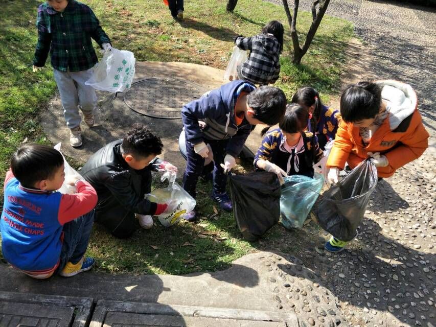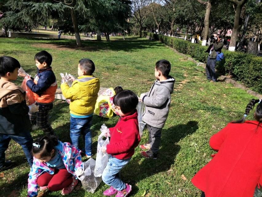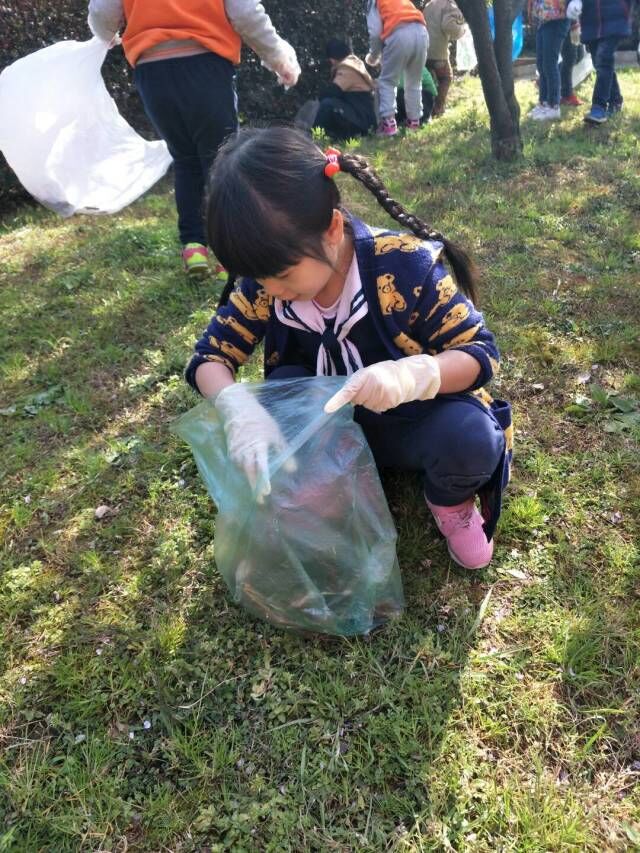 大一班的老师将爸爸妈妈们事先准备好的手套、垃圾袋等物品分发给每个孩子并讲解了各种规则。瞧!这群孩子,别提多兴奋、多积极了,一个个低头细细搜罗着草地上、小路边的垃圾。