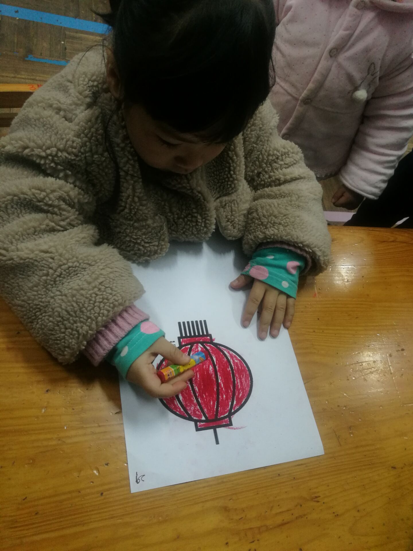 开始画之前,先让小朋友看图片上的灯笼,问小朋友都见到过吗?有些什么颜色?灯笼外面的图案是怎么样的?什么时候人们会挂上灯笼?小朋友啊特别的聪明都回答出来啦!那接下来我们就来给大灯笼穿上最好看的衣服吧!如果你也觉得我们的小朋友特别的棒,那就夸夸他们吧!