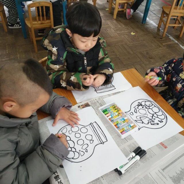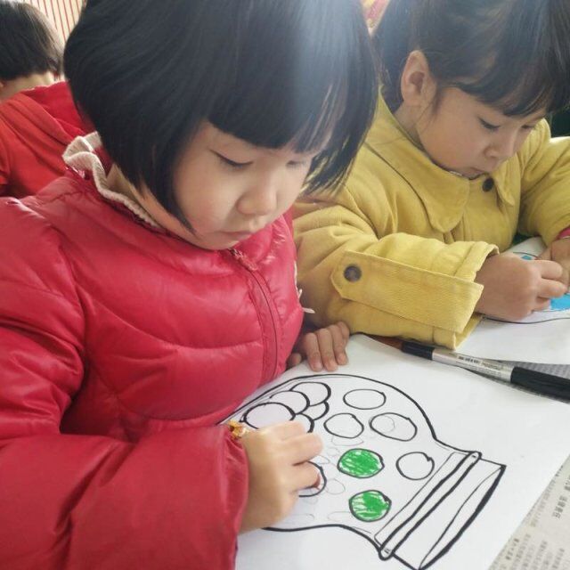用“一根线儿有两头,两头踫踫变个圆”的术语教幼儿画圆。教幼儿娴用小食指在桌子上画圆。尝试用手划圆之后。小朋友们都些迫不及待想在纸上绘画了。这次我们使用了马克笔画圆和蜡笔涂色,马上小朋友们就开始了画圆之旅,瞧!出现了各种各样装糖豆的瓶子,都装得满满的哦~
