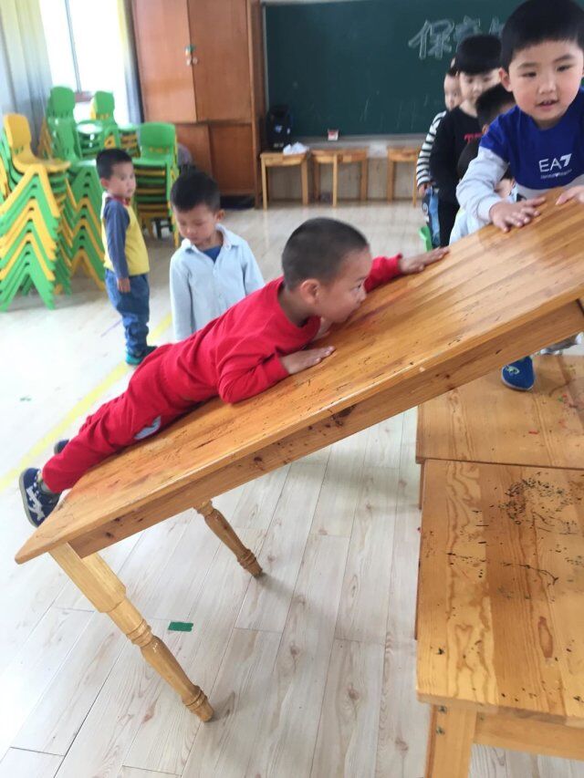其次,在组织策略方面,入场老师选用动感的音乐激发幼儿的激情,带领幼儿绕场跑步热身,接着,为了让幼儿更好地进入活动状态,以桌子为辅助物进行听信号做动作热身运动,幼儿的兴趣和状态都被激发了,提高了幼儿的积极性。游戏中,老师创造的桌子滑滑梯,让宝贝们感受到了极大地乐趣,发展幼儿的平衡、钻爬、攀登等能力,提高了幼儿敏捷性、协调性。逐渐形成与同伴合作的意识以及培养幼儿勇敢、克服困难的品质,体验游戏的快乐。
