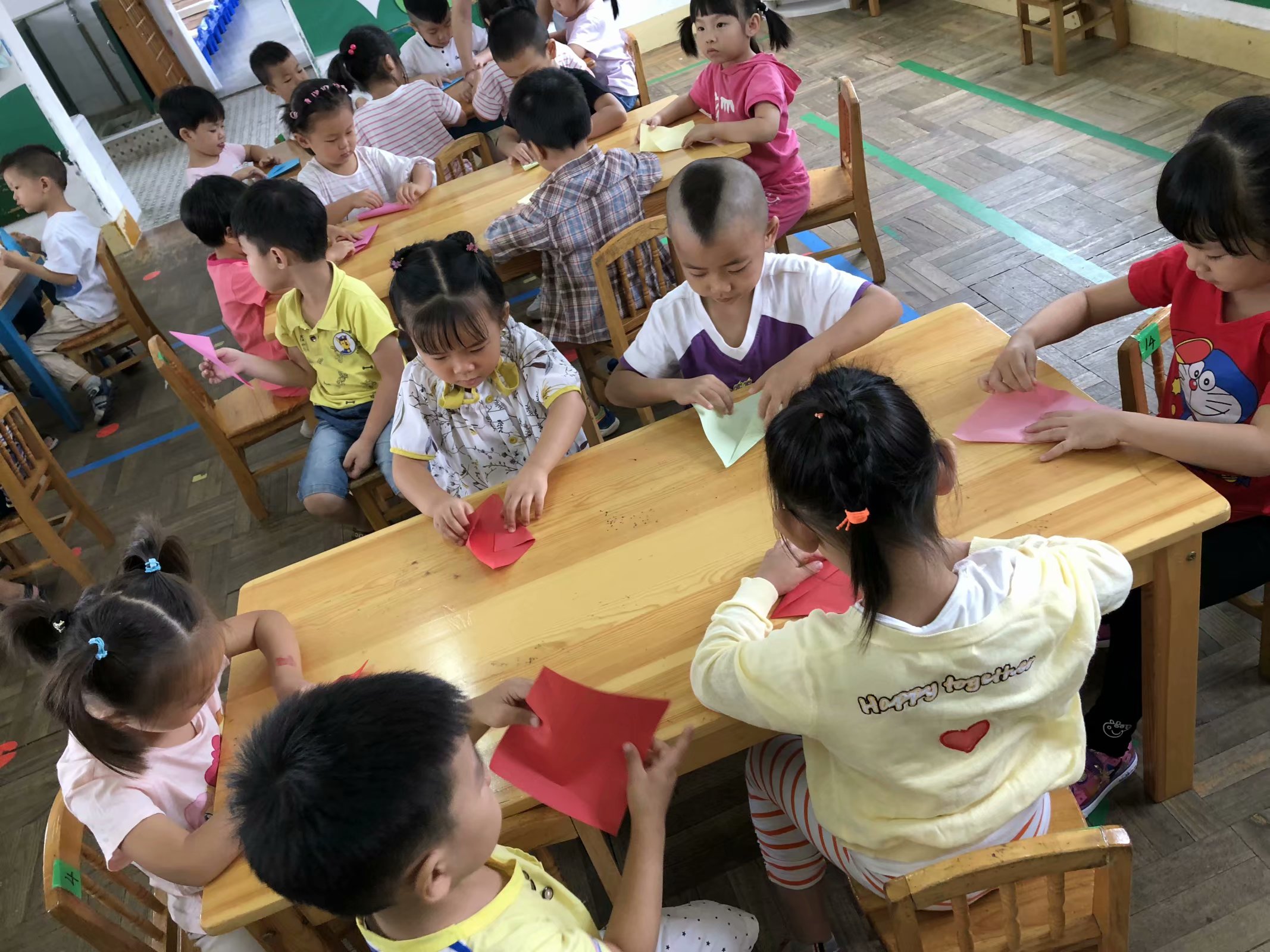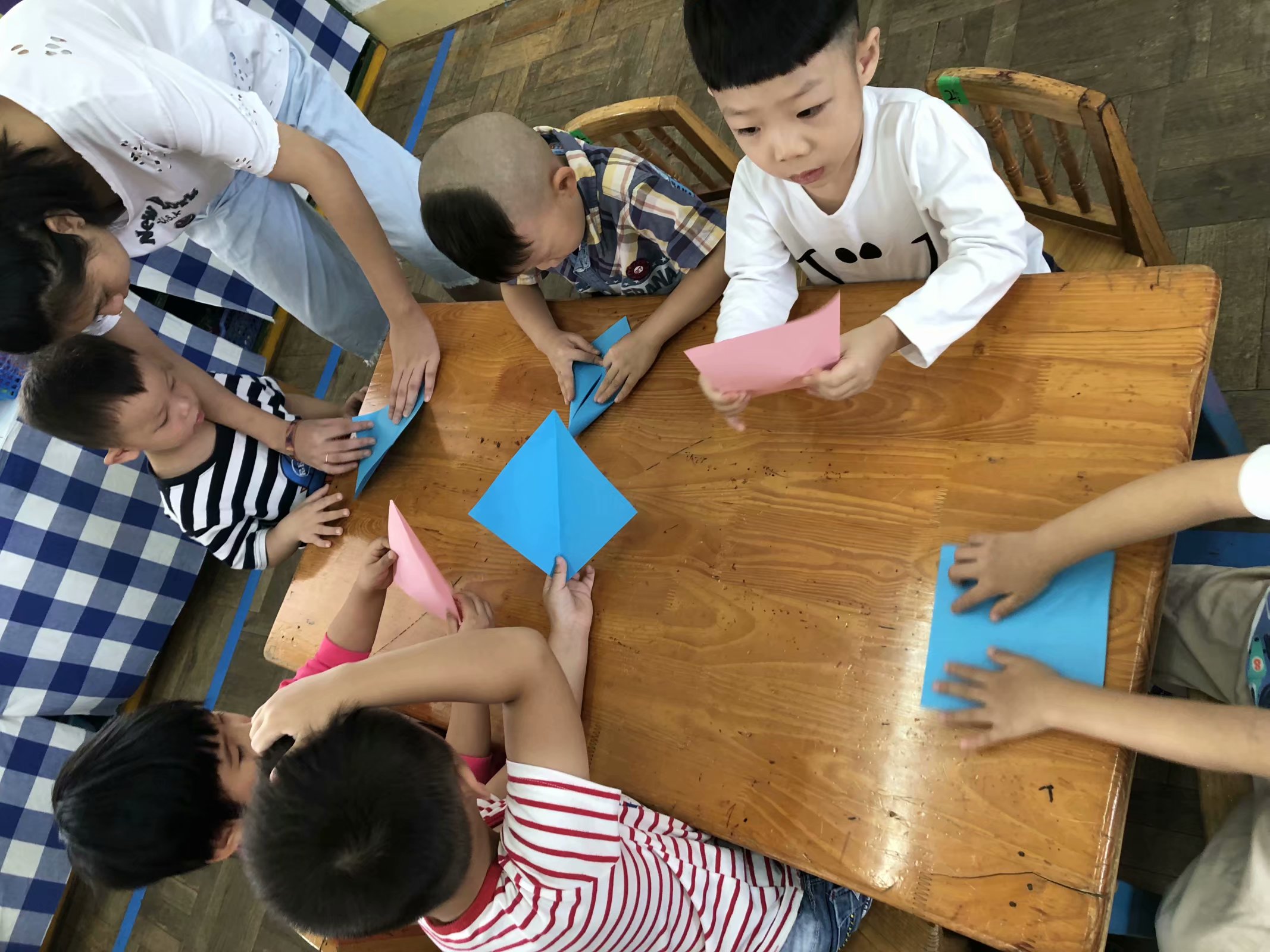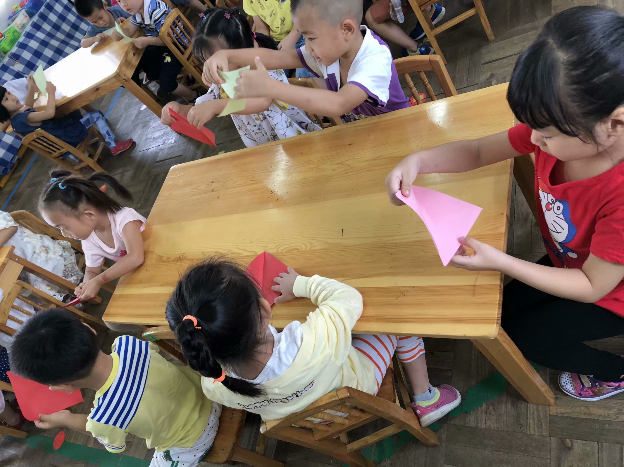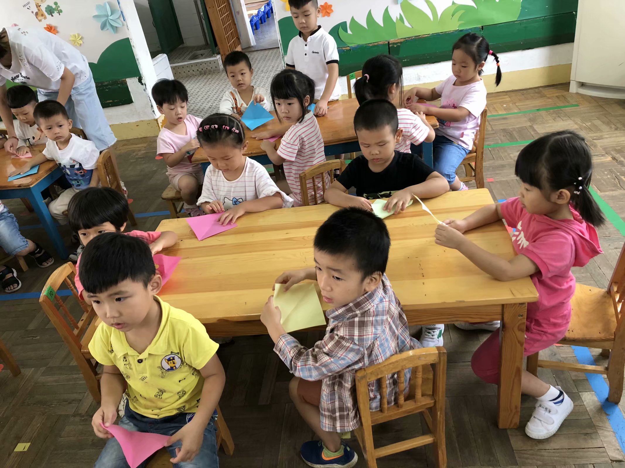 折纸活动是一种深受幼儿喜爱的艺术活动形式,它既能锻炼孩子手的灵活性,发展孩子 的目测力、空间想象力和操作能力,同时还可以形成孩子的几何形体概念。随着幼儿园教育 改革的深入,过去活动的模式已经不能适应现代幼儿教育的发展,现在我们关注的是幼儿学 习的过程,而不是学习的结果,注重的是幼儿在活动的过程中是否进行了主动积极地参与, 而不是被动的接受教育,强调的是幼儿在活动中的情感体验,是否从活动中获得自尊、自信, 而不是知识的简单复制。幼儿在活动中体验到了折纸活动的乐趣,便是最大的收获!