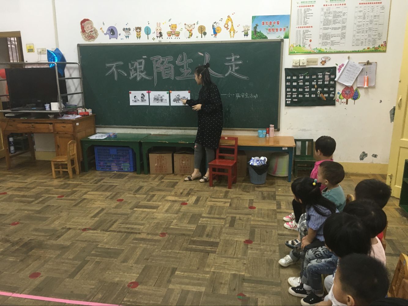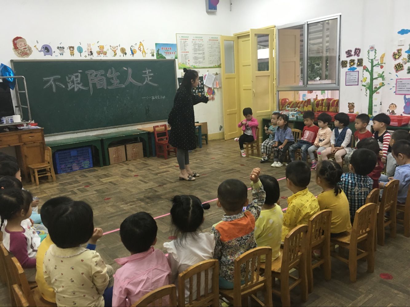 回到教室后,老师告诉小朋友们如果跟陌生人走有可能会发生危险的事情,并教孩子们在某些陌生人带来的“诱惑”下,应该学会拒绝,不跟陌生人走。若是遇到陌生人强行抱走的情况,就大声呼救。经过这一次活动,孩子们加强了安全意识,有些小朋友还保证以后再也不跟陌生人乱走了。