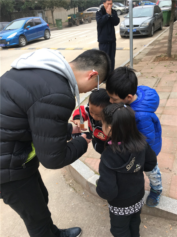上午十点整,各班课间操结束后,教师回班级组织幼儿开展桌面区角活动。将幼儿安置好后,一名教师至门卫传达室观看监控,其余教师躲在寝室。友情出演的14位“骗子”纷纷进入各班活动场地,以不同方式引诱“拐骗”班级里的孩子跟着自己走。行骗人员运用的“骗术”也是多种多样的,有的叫出孩子的名字,然后告诉孩子说老师或爸爸妈妈在楼下找你,委托前来带孩子走。有的用“物资利诱法”让孩子玩玩手机游戏、玩具让其跟着走。有的跟孩子聊聊天,熟悉后再说带去游乐场玩……个别孩子经不住诱惑直接跟着“骗子”高高兴兴地走去了幼儿园大门,但有了上次的防拐演习经验,大部分孩子们的安全意识明显增强了许多,各班幼儿被拐骗出来的人数明显减少!