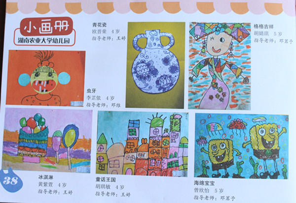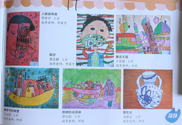 作品有中班欧晋荣的《青花瓷》、黄紫萱《冰淇淋》、胡琪敏和王语涵的《童话王国》、李芷依的《虫牙》、吴安琪的《睡梦中的城堡》、唐诗韵的《甜甜的冰淇淋》、吴潇恩的《青花瓷》。大班胡婧琪《格格吉祥》、曾欣怡的《海绵宝宝》、粟若翀的《人脸装饰画》。