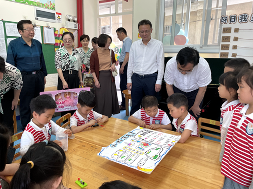 陈弘书记一行首先来到了大班的区角活动现场,陈书记俯身与孩子亲切互动,一同探讨科学发电的奥秘;