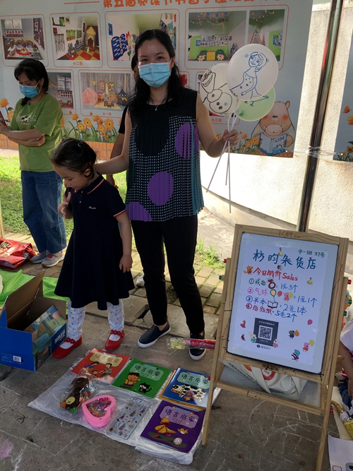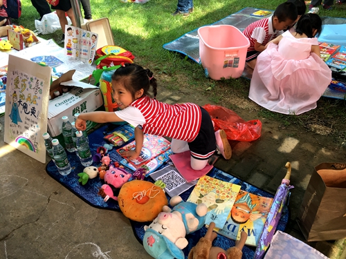 孩子们在家长们的陪伴下,早早来到自己的摊位上摆放事先准备的书籍和旧玩具,有玩具、幼儿图书、学习用品、手工制作、特色零食、小饰品等,有些“小老板”还为自己的摊位制作了创意海报。
