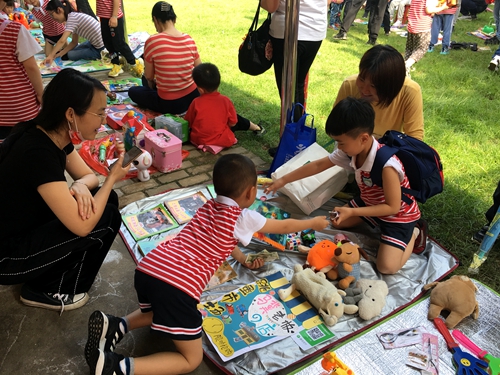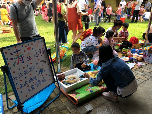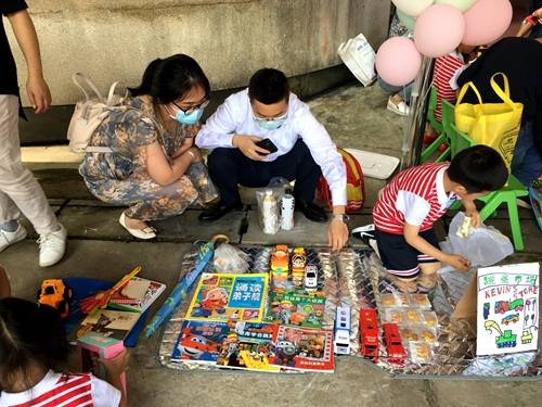 孩子们在家长们的陪伴下,早早来到自己的摊位上摆放事先准备的书籍和旧玩具,有玩具、幼儿图书、学习用品、手工制作、特色零食、小饰品等,有些“小老板”还为自己的摊位制作了创意海报。