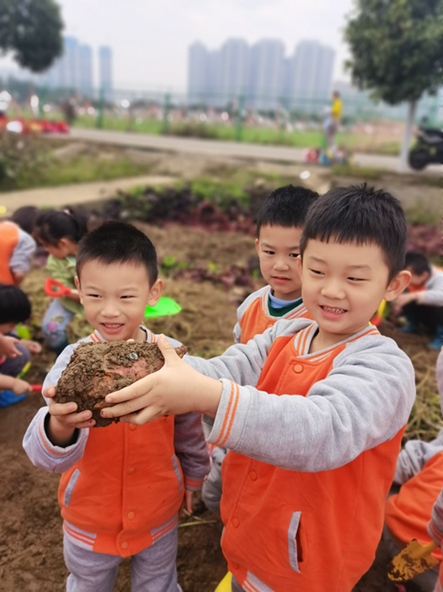 大多数孩子都是第一次看到生长在田地里的红薯,当挖开土地,看到大大的红薯露出头来的时候,惊奇和喜悦之情溢于言表。“比一比看谁挖出来的红薯大?”“比一比看谁挖出来的红薯多?”