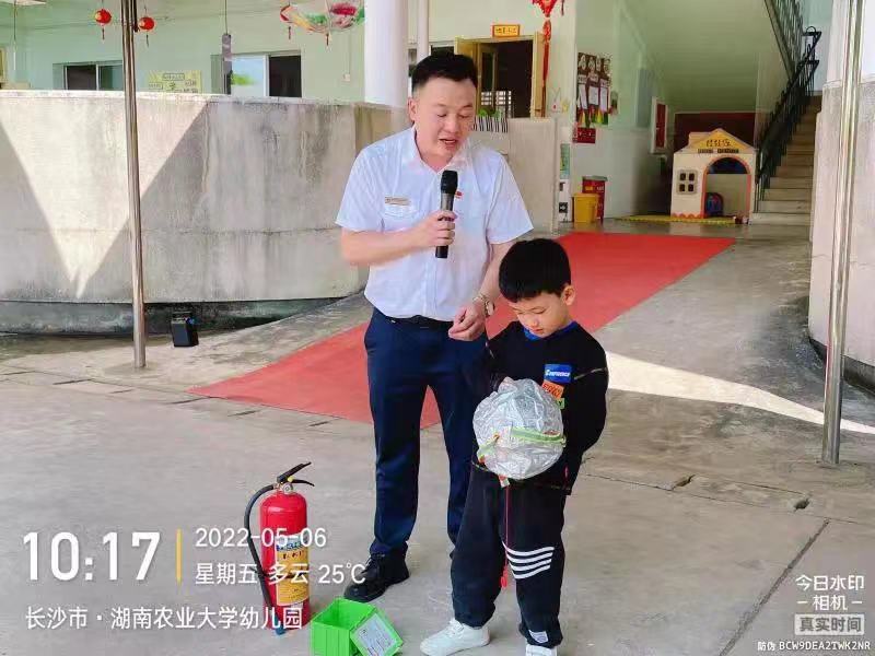 最后,王松清教官对全体教师和孩子们开展了一场生动的消防培训。他向孩子们演示了湿毛巾、防毒面罩、灭火器的正确使用方法,并邀请小朋友上来尝试佩戴防毒面罩。